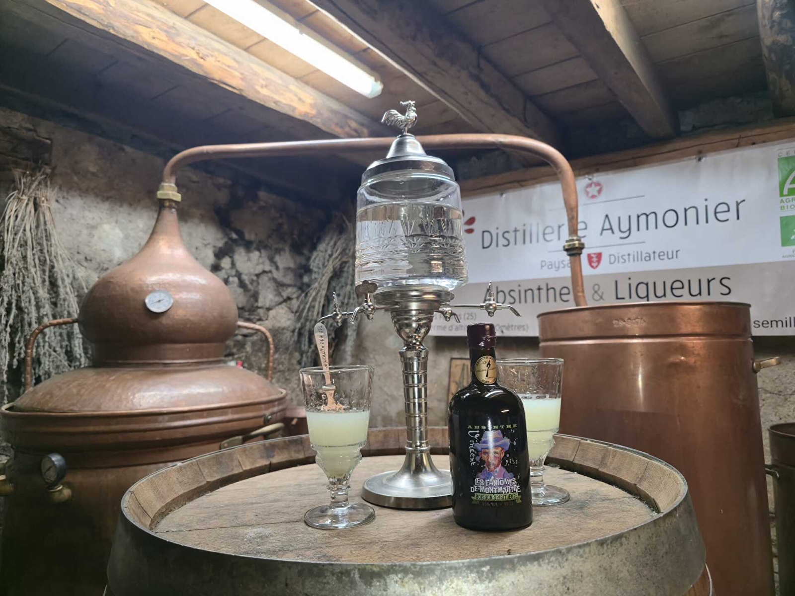 Première distillerie artisanale bio de la zone historique, nous distillons une vingtaine de recettes d'absinthes différentes ainsi que des anisés, de la vodka, du gin, un apéritif à la gentiane et des liqueurs.