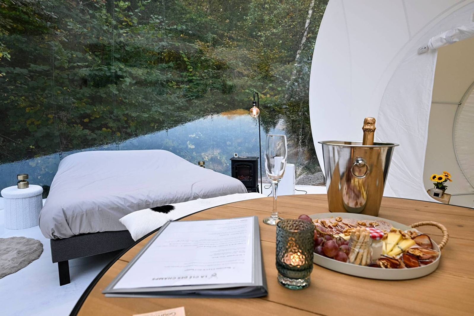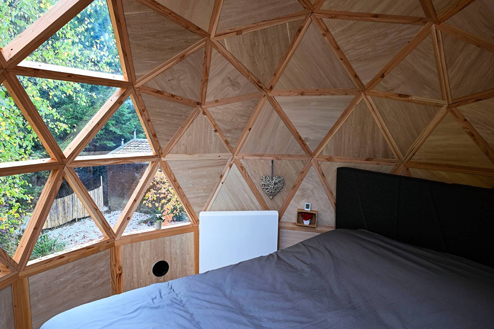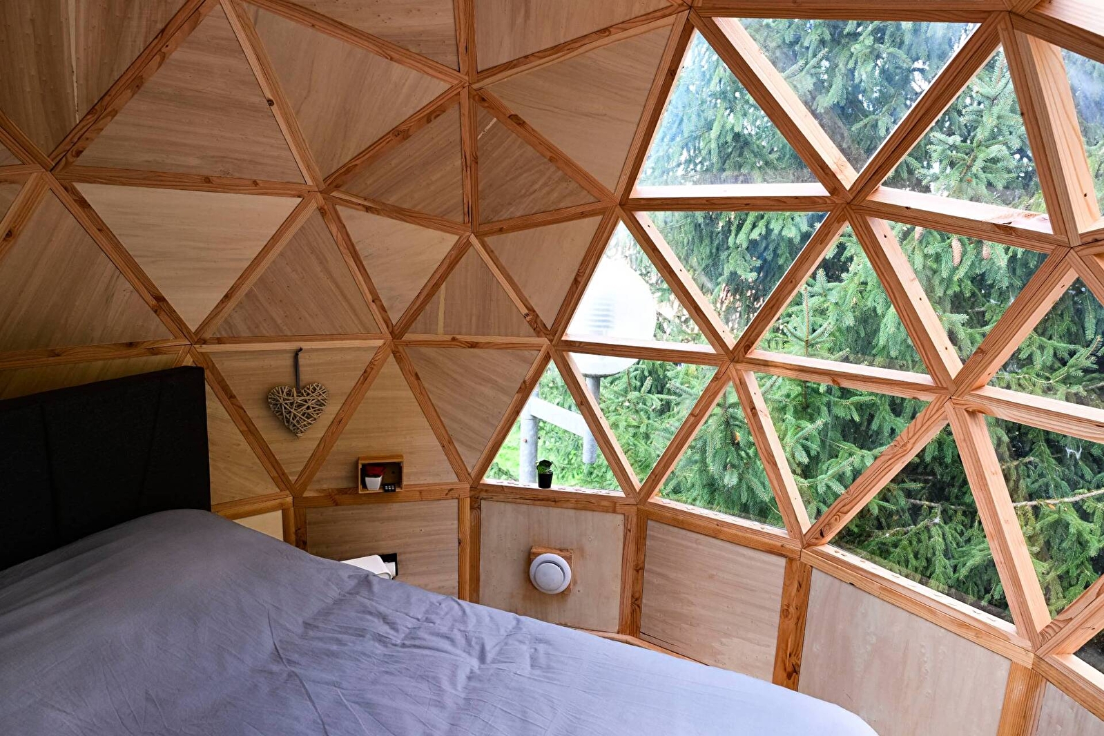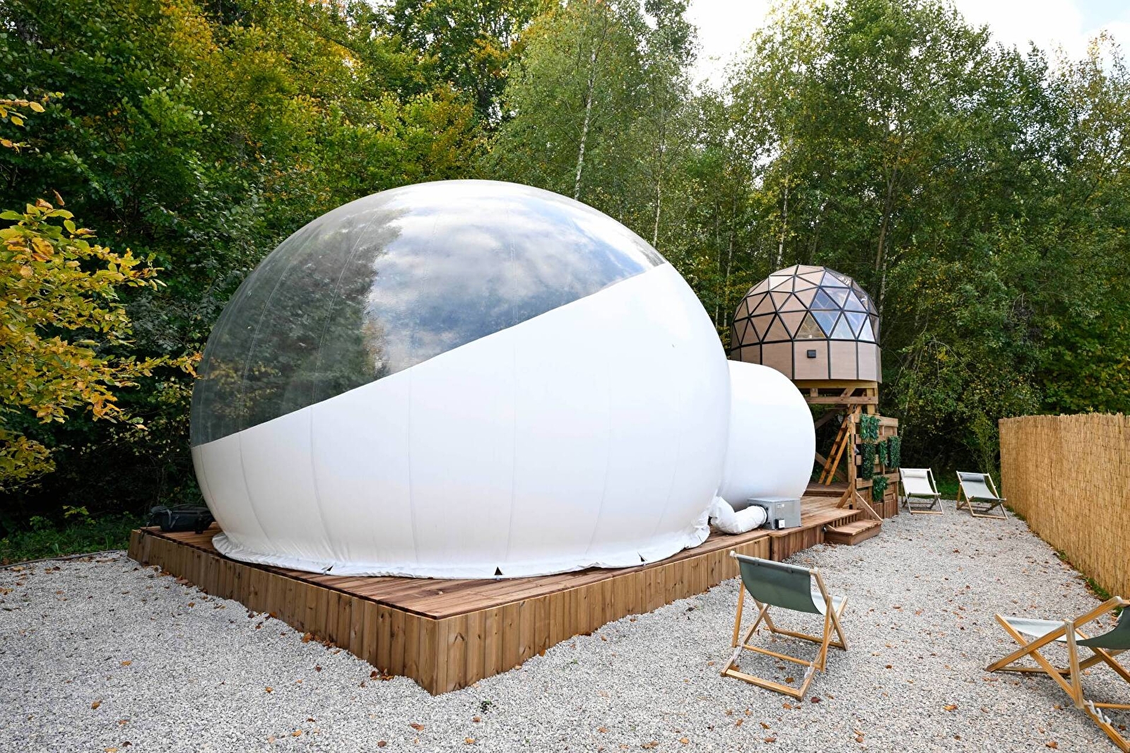 Succombez au charme du grand dôme d’Olia, un hébergement insolite et spacieux, conçu pour 2 à 4 personnes. Véritable bulle de sérénité sur deux niveaux, sa transparence vous plonge au cœur de la nature pour une expérience féérique, entre ciel et verdure. Détendez-vous dans votre bain nordique privatif, profitez d’une terrasse exclusive et laissez-vous bercer par le calme environnant pour un séjour inoubliable.