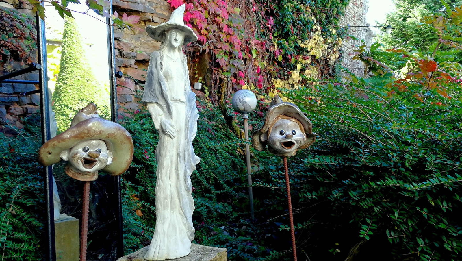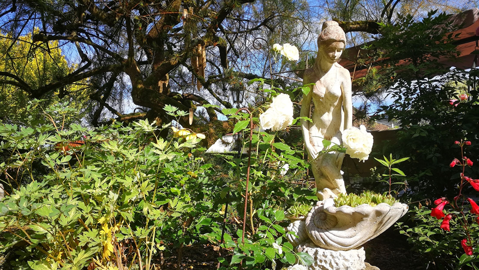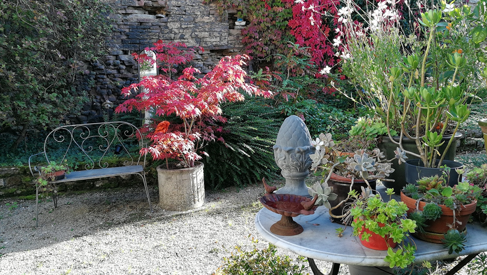 La terrasse avec salon de jardin et l'espace détente sont installés dans le jardin romantique et fleuri.