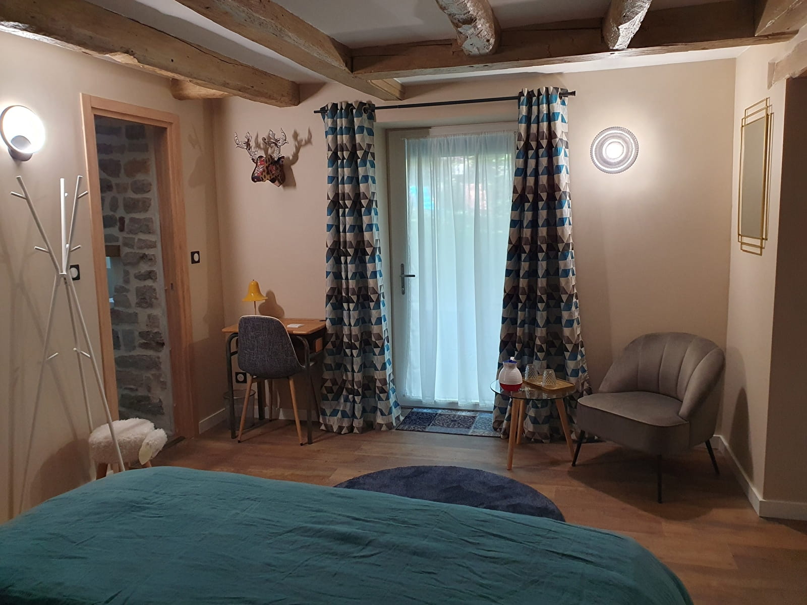 La chambre Indigo reflète l'esprit de l'établissement Le Terrier : un mélange de caractère et de finitions soignées. Les propriétaires ont pensé chaque détail de l'aménagement, privilégiant des matériaux nobles et des textures qui invitent au repos.