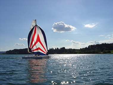 Pour poursuivre les sensations de glisse sur l'eau, on mise sur le catamaran. Le Dart 16, ni trop pointu ni lourdaud, navigue bien sur le lac de Saint-Point. De 3 à 5 séances de cours suivant les âges permettent de naviguer seul. Prêt à naviguer en solo ? Avec des vents dès force 2 à 3, les plus à l’aise vont pouvoir soulever un flotteur et ils s'installeront au rappel si la brise forcit.