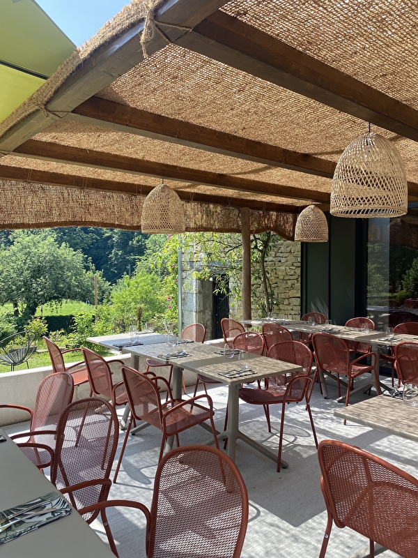 Profitez de la terrasse aux beaux jours, avec vue sur le verger bien à l'abri de l'ombrière en matière naturelle, préférez la salle du restaurant installée dans l'ancienne grange ou encore lovez-vous dans de confortables canapés dans l'ambiance intimiste d'une salle voûtée.