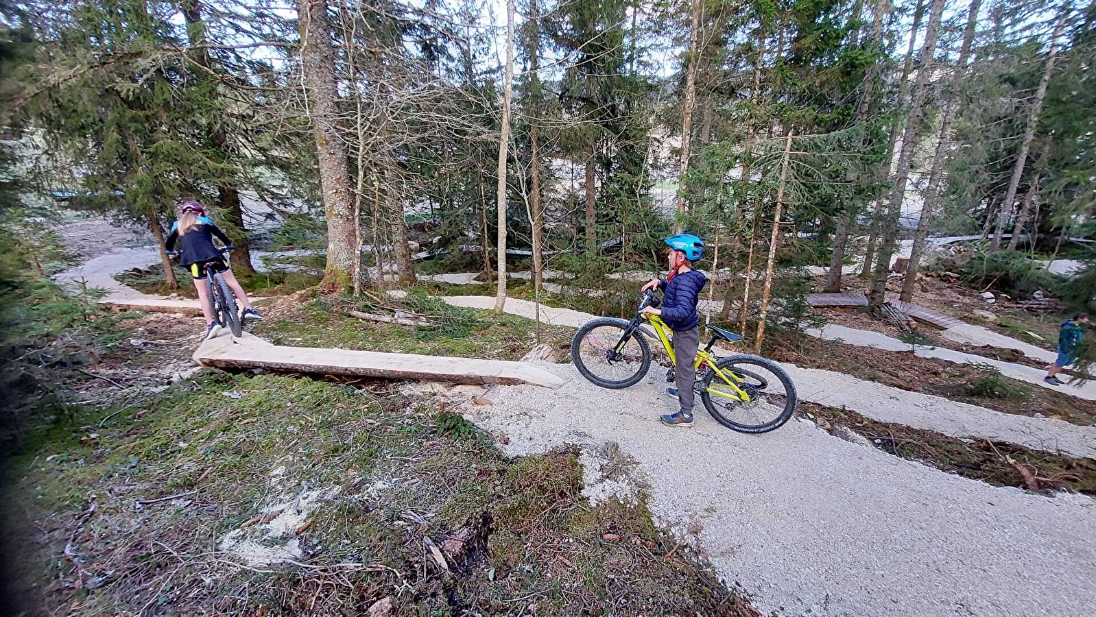 Joli pumptrail : pumptrack en forêt avec des obstacles naturels